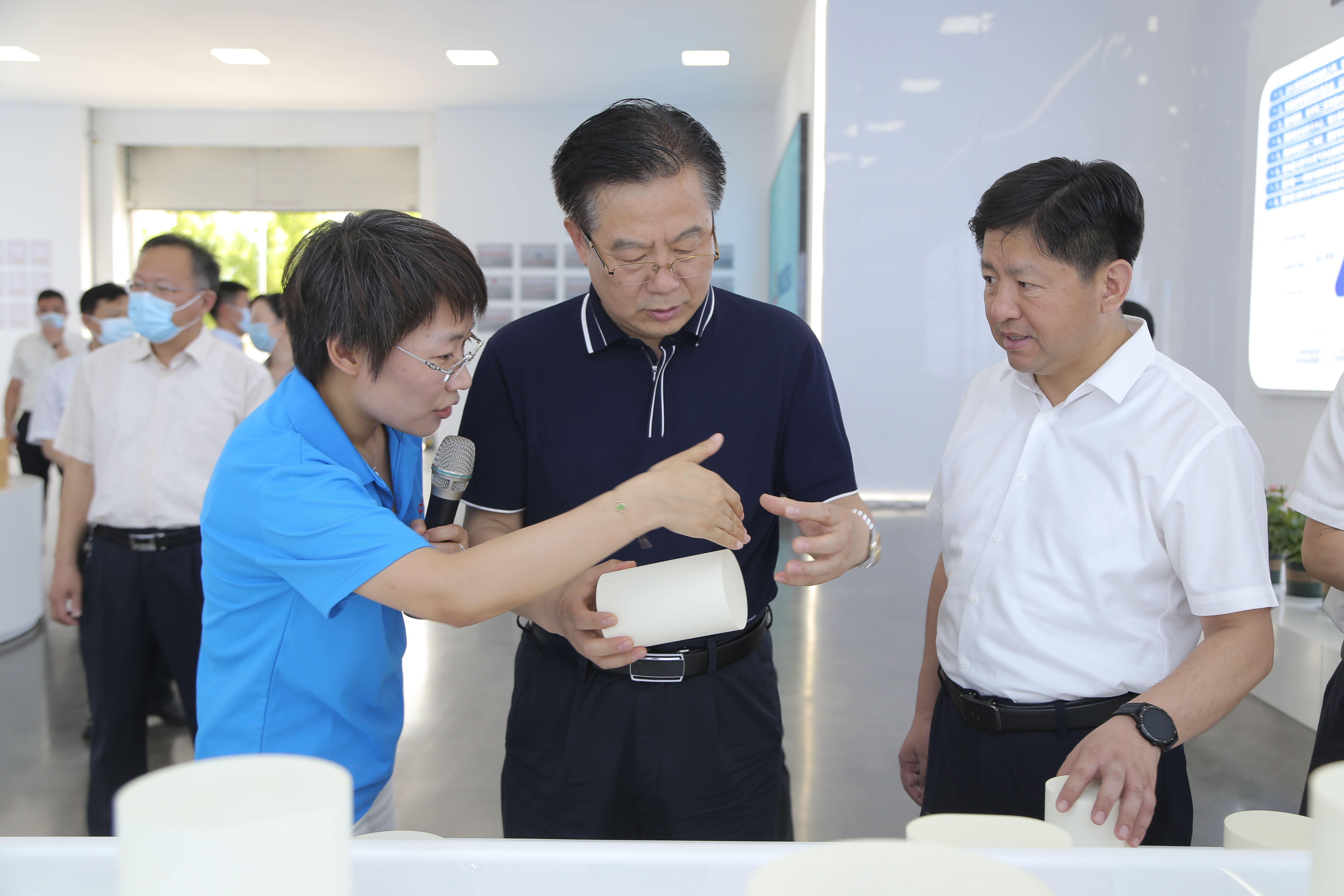 张斌一行首先来到蜂窝陶瓷载体生产厂区,观看公司宣传片,参观车间展厅,听取了年产5000万升汽车尾气净化用蜂窝陶瓷产业化项目进展情况,详细了解公司生产经营等情况,对公司打破国际垄断,推动高端蜂窝陶瓷国产化取得成绩给予高度评价。